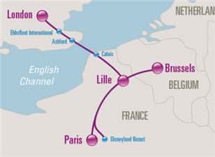 歐洲之星穿過英吉利海底隧道,以每小時186英里(300公里)的時速開行在法國、比利時和英國的高速線上。旅客從倫敦市中心登車,到達巴黎市中心只需2小時15分鐘,而到達布魯塞爾為1小時51分鐘。