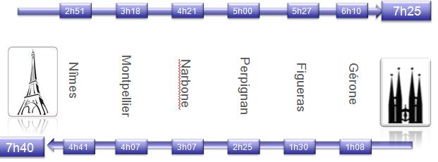 - 從巴黎至巴塞羅那每日9趟往返列車,經停26個不同車站,包括3趟從巴黎往返馬德里的列車。